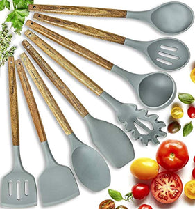 Silicone Cooking Utensils Kitchen Utensil Set - 8 Natural Acacia