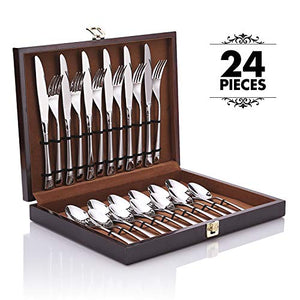 Elegant 24 Piece Flatware Set, Dinnerware Set Service for 6 with Wooden Gift Box ( Silver )