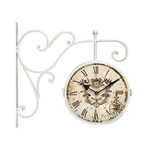 White Iron Round Double-Sided Wall Hanging Clock with Scroll Wall Mount