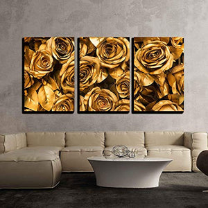 3 Piece Canvas Wall Art - Golden Fabric Roses Background - Stretched and Framed Ready to Hang - 24"x36"x3 Panels