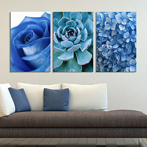 3 Panel Canvas Wall Art - Blue Rose Succulent Plant and Small Blue Flowers - Giclee Print Gallery Wrap